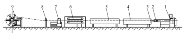 Saiki, pipa PVC lan PO minangka produk volume paling dhuwur ing domestik lan internasional.Gambar 1nuduhake diagram alur proses produksi kanggo pipa poliolefin (PO). Plastik wis panganan menyang annular longkangan mati (2) dening meneng minangka nyawiji seragam plasticized, extruding pipa parison. Iki langsung lumebu ing unit kalibrasi (3) kanggo cooling lan ukuran, banjur ngalami cooling luwih cukup ing tank cooling (4). Pipa ditarik metu kanthi kacepetan konstan kanthi luwesunit angkut(6), lan pungkasane dipotong nganti dawa sing ditemtokake dening pemotong (7). Pipa tembok lancip kanthi diameter ngisor 160mm bisa digulung dadi gulungan dening winder (9).