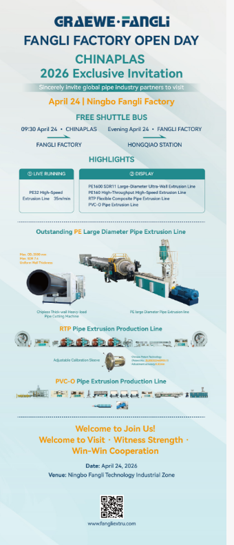 Saka 21 nganti 24 April ing CHINAPLAS 2026, bukak Fangli Technology ing booth 7.1C14. Ayo njelajah inovasi lan kerjasama mbesuk ing peralatan pipa plastik bebarengan!