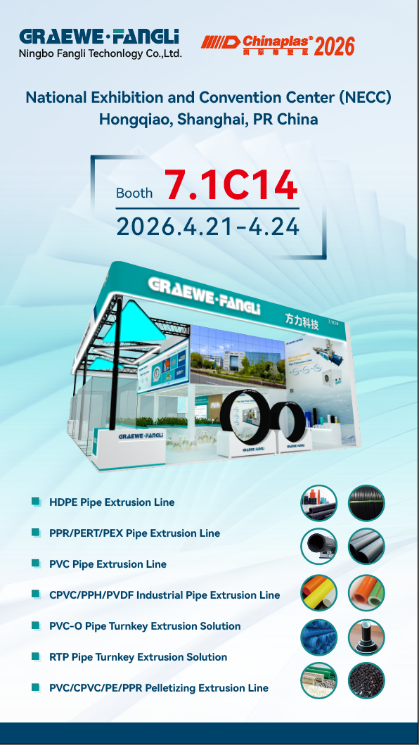 मराठी Sugeng rawuh ing booth 7.1C14 ing ChinaPlas 2026,Ningbo Fangli Technology Co., Ltd.(sabanjuré diarani "Fangli") spesialisasi ing R & D, produksi lan dodolan sakaperalatan extrusion plastik, baris produksi pangayoman lingkungan anyar, mesin las pipa plastik lan mesin bantu plastik.
